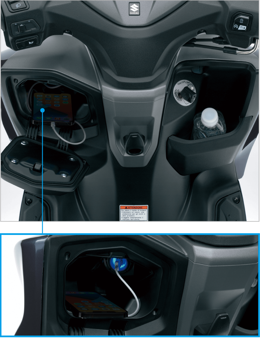 Practical front compartmentsThe left-side front compartment is large enough to accommodate a large-screen smartphone. Its lid closes to offer extra protection against the elements. On the right side is a quick-access inner pocket that offers enough storage capacity to hold a 500ml beverage or some other small item you may want to keep close at hand.USB OutletThe standard equipment 2A USB outlet lets you charge your smartphone on the go. The outlet is conveniently located inside the cover of the left-side front compartment. An attractive blue LED remains lit as long as the ignition is turned on, making the outlet easy to locate, especially at night or in dark conditions.* Stowed items are shown for illustrative purposes only.